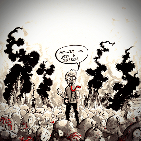 Every Monday I would post a comic illustration that would be a fantastical scene, generally bad, and I would state that I hate Mondays. At the end of the week, I would resolve the situation; this would mostly be a humoristic twist on the beginning of the week. It was fun to do, as it sort of was two pieces of storytelling, and the general meat and in-between filling would happen in the reader's mind.